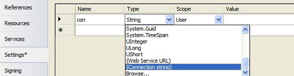 y escogemos la pestaña Settings en el lado izquierdo, ademas cambiamos el valor de Name a: con y el de Type a Connection String tal como se muestra